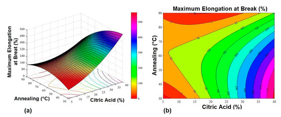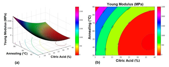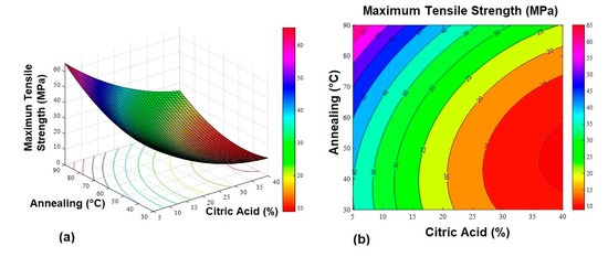 Multiple regression analysis was used to obtain the second-order models, which relate the annealing factors and citric acid concentration with MTS, YM, and MEB. The model equations for the response variables are: