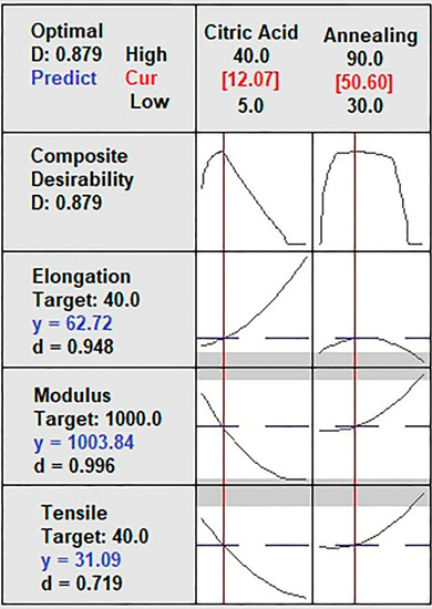The RSM was used to analyze the effect of the annealing and the concentration of citric acid on the Maximum Tensile Strength (MTS), Young’s Modulus (YM), and Maximum Elongation at Break (MEB) mechanical properties. Table 1 shows the results obtained from the central composite design (CCD).