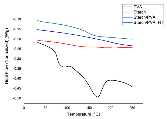 DSC thermograms of PVA, starch/PVA and starch/PVA HT.