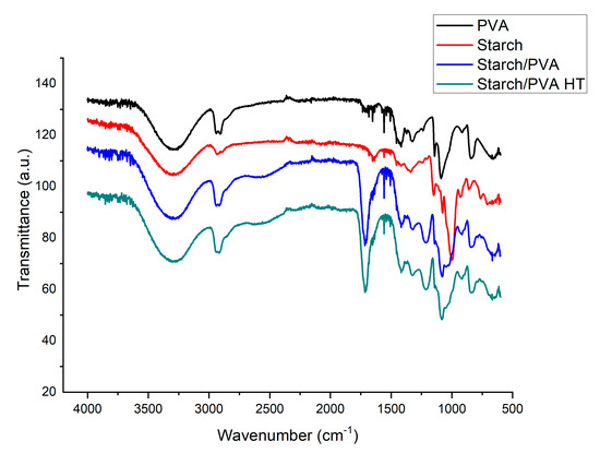 FTIR spectra of PVA, starch, starch/PVA and starch/PVA HT.