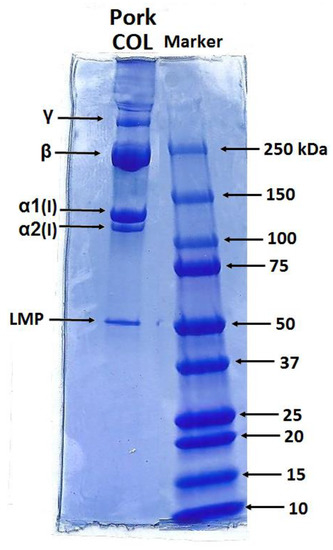 Figure 1 shows the electrophoretic profiles of the porcine collagen. Protein patterns, comprising α1 and α2 chains with an average molecular weight of 130–110 kDa, and their dimer (β chain) and trimer (γ chain) forms, are shown. The band intensity ratio of the α1 and α2 chains was approximately 2:1, suggesting that isolated COL comprised type I, which existed in two configurations: α1(I)α2(I)α3(I) and [α1(I)]2α2(I) [35]. The electrophoretic mobility of the α1chain and α3chain was similar and, therefore, they were unable to isolate under electrophoretic conditions [36]. The band with higher molecular weight ~250 kDa belonged to β-component and was revealed to be the main component of the SDS-PAGE profile. The visible band over 250 kDa could be attributed to γ chain. On the other side, the profile also comprised lower molecular peptide (LMP) components visible at 50 kDa.