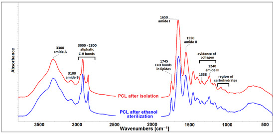 FTIR spectrum of porcine collagen lyophilisate (PCL) after isolation and after ethanol sterilization.