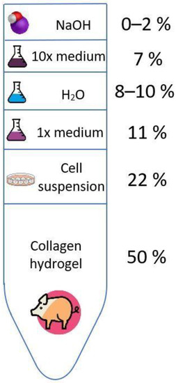 All components were sterilised and cooled to a temperature of approximately 4 °C. First, collagen hydrogel was mixed with all components except cell suspension using two sterile syringes with Luer-lock coupling. Collagen was mixed with 10x culture medium, H2O, 1× concentrated culture medium and NaOH at the following ratios: 1:0.14:0.16–0.2:0.22:0–0.04. After neutralization, 0.44 of the previous part of the cell suspension was added and mixed using the next syringe. The ratio of components in the bioink is also shown in Figure 11. Due to the 50% collagen content of the bioink, our final collagen concentration was 10 mg/mL. Immediately after mixing, the syringe with the bioink was placed in the cooled bioprinter holder and printing was started. The printing process was carried out under sterile conditions in a laminar flow box.