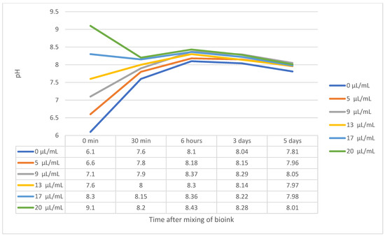 Increasing the pH of the samples caused a lower viscosity of the bioink, which then took longer to solidify. For this reason, the printing speed needed to be regulated as shown.