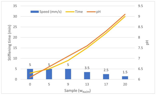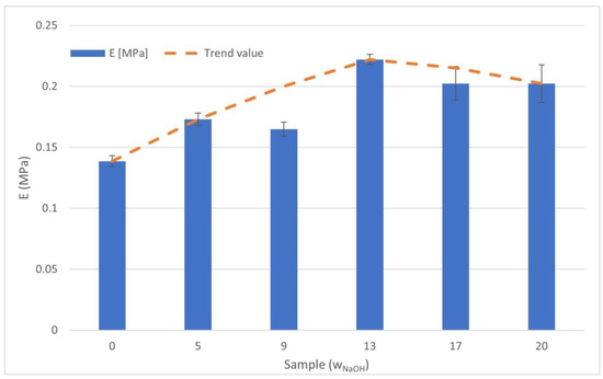 The compressive modulus was calculated for samples of all NaOH concentrations. The measured elastic modulus showed a characteristic pattern in which the value increased with increasing of the NaOH concentration up to a sample with 13 μL/mL, after which it started to decrease again, as shown in Figure 12. The highest value (13 μL/mL) was 0.2221 ± 0.0042 MPa, and the lowest value (0 μL/mL) was 0.1386 ± 0.0044 MPa. The orange dashed line on the graph shows the predicted trend of the values. The sample value of 9 μL/mL differed from this trend, resulting in a falsely lower value due to the inaccuracies described in the above discussion.