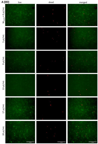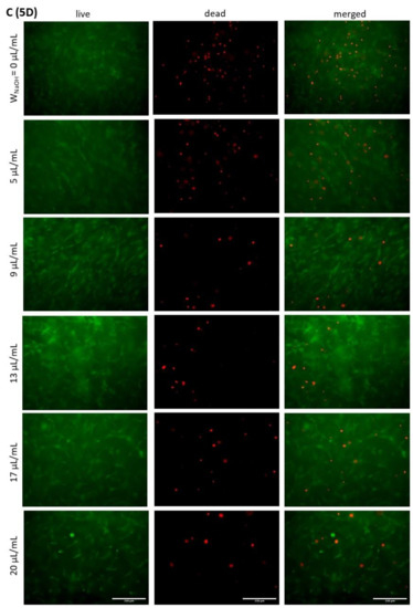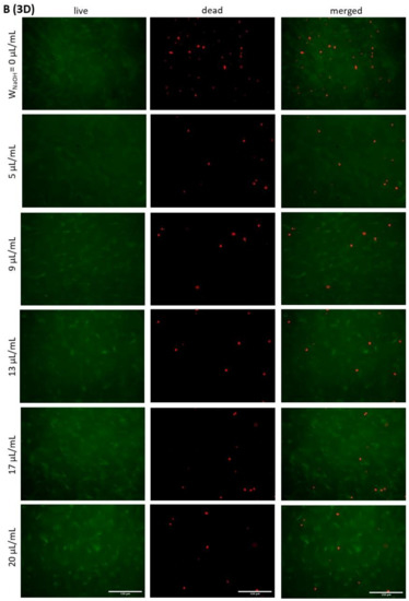 Analysis of dead and living cells showed that there are places in the gels where most of the cells are dead. The cultivation of 3D scaffolds is practically limited by the thickness of the scaffold, with simple diffusion only transporting nutrients and oxygen, and removing of waste products, for structures up to a maximum thickness of 2 mm [51]. This is the case if the environment is homogeneous. In hydrogels with a collagen-type polymer, a higher density of fibres may be concentrated at one location, preventing diffusion, and the location is not optimally nourished. In bioprinted structures, there are also irregularities in gel shape, as described above, with some sites exceeding the 2 mm limit. In general, a vascular supply is required for tissues with a thickness greater than 2 mm [51], which is obviously not possible in the case of hydrogel scaffolds. However, the application of pressure loading in a dynamic culture system that promotes perfusion, cell proliferation and differentiation could improve this problem [52]. The mechanical stimulation of seeded hydrogels also helps in the remodelling of surrounding tissue by cells [53]. Further research on proliferation and differentiation in highly concentrated bioinks should be focused in this direction.