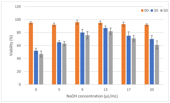 It is known that the concentration of collagen and, therefore, the stiffness of the gel affects cell viability. In our work, we compared hydrogels where the concentration of collagen was identical, but the acidity of the gels was modified by the addition of NaOH. According to the literature, the optimal pH of the environment for cell growth is 7.38–7.87 [42]. Our prepared gels, immediately after mixing all components, reached values of 6.1 to 9.1. After crosslinking the gels in an incubator at 37 °C and in a 5% CO2 atmosphere, the values were adjusted to slightly basic values, from 7.6 to 8.2, due to the presence of buffers in the bioink components. The gels then became more acidic due to cell metabolism after 3 and 5 days of cultivation.