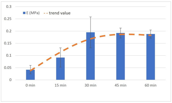 Compressive elastic modulus of samples with different gelling times. Bars show the mean value with SD, and the dashed line represents the trending value.