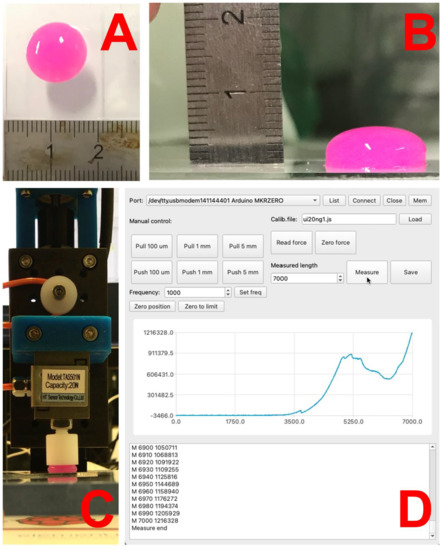 Printed bioinks on microscope glass: (A) top view; (B) side view. Estimation of mechanical properties: (C) custom testing device with linear actuator and force sensor; (D) custom control and acquisition software.