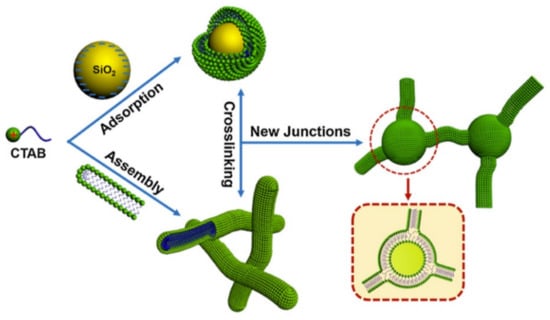 The enhancement of the rheological properties results from the binding of micellar end-caps to the surface of the NPs, leading to elongation or cross-linking of the micelles by the NPs (Figure 1) [92]. WLMs can interact with a large variety of NPs regardless of their size, shape, and surface functionality [93]. When the NPs are oppositely charged with respect to the surfactant ions, the electrostatic interactions govern the adsorption, and the surfactant is attached to the NPs via its charged head-groups, leaving the hydrophobic tails outside. To exclude the contact of these hydrophobes with water, a second surfactant layer is attached in such a way that the hydrophobic tails face the tails of the first layer, leaving the hydrophilic heads in contact with the water. Thus, in the case of NPs oppositely charged with respect to the surfactant ions, the surfactant double layers are formed. The formation of the double layer results in the charge reversal of NPs, as was demonstrated by the ζ-potential measurements [94]. When the NPs are hydrophobic, the hydrophobic interactions govern the adsorption [95], and the surfactant is attached to the NPs by its hydrophobic tails, forming a monolayer with the polar groups exposed to water. The surfactant can adsorb on the NPs even if they are similarly charged, due to the hydrophobic interactions; in this case, hemimicelles are formed [96].