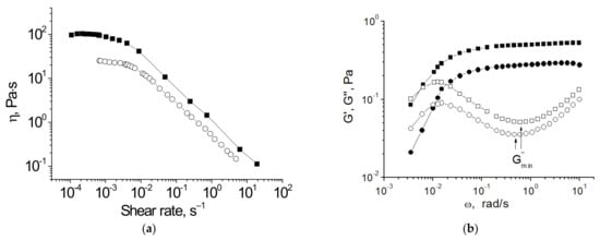 Viscosity as a function of shear rate (a) and frequency dependences of storage modulus G’ (filled symbols) and loss modulus G” (open symbols) (b) for 0.6 wt % erucyl bis-(hydroxyethyl) methylammonium chloride solutions with 1.5 wt % 300 nm magnetite particles (squares) and without nanoparticles (circles) at 20 °C. Solvent: 1.5 wt % KCl in water, pH 11. Reprinted with permission from Pletneva V.A., Molchanov V.S., Philippova O.E. Langmuir 2015, 31(1), 110–119. Copyright (2015) American Chemical Society.