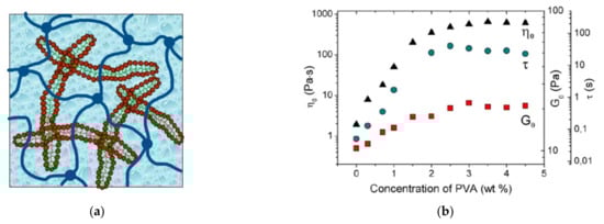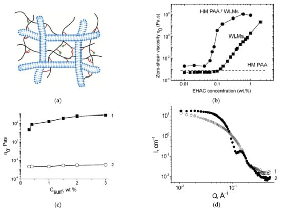 HM-polymers usually have a main hydrophilic water-soluble backbone and some amount of grafted hydrophobic water-insoluble groups. Such polymers mainly interact with WLMs via their hydrophobic moieties, which can embed into the micelles without their disruption. In this case, common networks of HM-polymer and WLMs can be formed (Figure 3a), and polymer hydrophobic groups serve as “physical” cross-links between the macromolecules and the WLMs. This results in the increase in viscosity and the synergistic enhancement of the viscoelastic properties and temperature stability.
