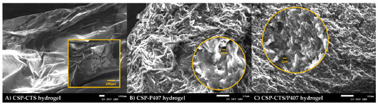 Scanning Electron Microscope micrographs images obtained for: (A) CSP-CTS hydrogel at 50× (magnification 850×); (B) CSP-P407 hydrogel at 1200× (magnification 4300×); and (C) CSP-CTS/P407 hydrogel at 1200× (magnification 4500×).