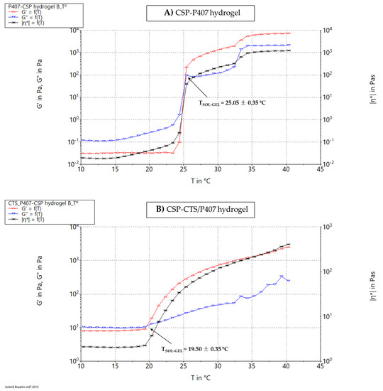 Regarding the CSP-CTS/P407 hydrogel graph (Figure 2B), the crossover corresponding to the TSOL-GEL took place earlier, at 19.5 °C and compared to the CSP-P407 hydrogel graph, at low temperatures the values of both G’ and G’’ moduli were much higher. It has been indicated that using a 20% (w/v) solution of poloxamer, with the addition of chitosan (1.5% w/v) a syringeable, thermosensitive and mucoadhesive gel could be obtained [60]. However, in the case of CSP-CTS/P407 hydrogel, the addition of CTS modifies the properties of the system. CTS interacts with P407 through its polyethylene oxide chains, increasing the number of hydrophilic chains and therefore the thickness of the micellar crown. Due to this interaction, the apparent viscosity could increase and the temperature TSOL-GEL could decrease [52,61].