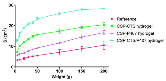 Spreading area (S, cm2) as a function of the applied mass (g) at 37 °C of reference and CSP-CTS, CSP-P407 and CSP-CTS/P407 hydrogels. Each value represents the mean ± SD (n = 3).
