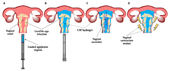 Schematic illustration of the mechanism of hydrogel application: (A) Administration into the vaginal cavity of the formulation through an applicator; (B) Expansion of the hydrogel through the vaginal cavity covering the infection focus; (C) Resistance of the hydrogel to vaginal secretion; and (D) Resistance of the hydrogel to vaginal contraction movement.