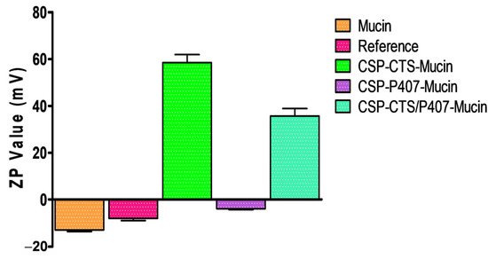 The mucoadhesive properties of vaginal formulations are essential due to the self-cleaning of the vagina. When compared the ZP data of the mucin solution with the ZP data obtained for the hydrogel-mucin mixtures, it was observed that the ZP value of the mucin dispersion, −12.86 ± 0.70 mV, changed when mixed it with the samples as shown in Figure 5. This change in value would be due to the interactions of the negative groups, such as carboxylate (COO−) and sulfonate (SO3−) of mucin with the positive groups of the polymers [63]. A polymer with mucoadhesive properties is able to neutralize the mucin charge [64]. The hydrogel that showed the maximum displacement was CSP-CTS, 58.47 ± 3.46 mV, confirming the mucoadhesive properties attributed to CTS due to its cationic nature [65], followed by CSP-CTS/P407, the reference and CSP-P407 with ZP values of 35.59± 3.15, −7.92 ± 0.98 and −3.89 ± 0.36 mV, respectively.