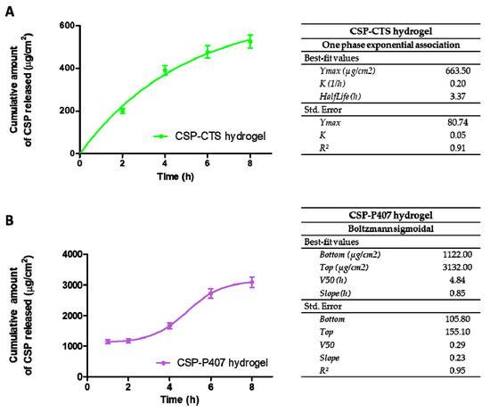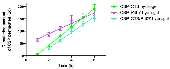 The release profiles of the CSP hydrogels can be observed in Figure 6. After 8 h, the highest cumulative drug release was registered for CSP-P407 hydrogel. Its micellar properties provide a system with excellent solubility [66]; followed by CSP-CTS/P407 and CSP-CTS.