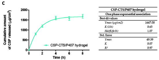 Cumulative amounts of CSP released from: (A) CSP-CTS hydrogel at 37 °C; (B) CSP-P407 hydrogel at 37 °C; and (C) CSP-CTS/P407 hydrogel at 37 °C. Data represent mean ± SD (n = 3).