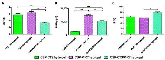 In order to compare the biopharmaceutical profile of all formulations, some amodelistic parameters (Figure 7) such as mean dissolution time (MDT), area under the curve (AUC) and efficiency (E) were calculated. CSP-CTS/P407 presents the lowest value of MDT, 1.7 h, compared to 2.9 and 3.2 h of CSP-P407 and CSP-CTS, respectively. This fact indicates that among three formulations, one of them is able to release the drug most rapidly and it could provide better bioavailability in the tissue. The AUC results are statistically different, being lower for CSP-CTS, 2660.0 μg/h, and higher for CSP-P407, 14,785.3 μg/h. Regarding the results of efficiency, CSP-CTS/P407 shows the highest value, 78.6%. Probably, the interconnected porous morphology of CSP-CTS/P407 favors a better distribution of the drug within the hydrogel compared to the chains and agglomerated micelles of CSP-CTS and CSP-P407, respectively.