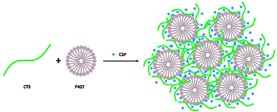 On the other hand, to prepare CSP loaded CTS/P407 hydrogel (CSP-CTS/P407 hydrogel), an appropriate amount of P407 and CSP was pre-mixed and kept at 4 °C. This mixture was dispersed in a pure CTS hydrogel to reach a final concentration of 2% (w/v) for CTS and CSP, and 20% (w/v) for P407. The formation of this hydrogel is represented schematically in Figure 10.