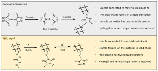 Urazoles are nitrogen-containing heterocycles that have been mostly used as precursors of triazolinediones (TADs) which have recently attracted attention owing to their click and click-like reactions [8,9,10,11,12,13,14]. Urazoles can readily be oxidized to TADs by strong oxidants [15,16]. Alternatively, some of the urazole derivatives can be aerobically oxidized to corresponding TADs by laccase enzyme [17]. Moreover, in situ oxidation of urazoles can be done by using a ruthenium photocatalyst [18]. In general, TAD or in situ oxidized urazole forms adducts where urazoles are bound to a material via urazole’s amide nitrogen (Figure 1). There are only a few reports where urazole is attached to material via its imide nitrogen [19,20]. However, in these reports urazoles were not explored as a main functional group. They were converted into corresponding TADs for further reactions.