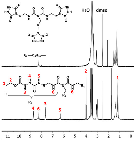 1H-NMR spectrum of the model compounds poly(hexamethylene semicarbazide) and poly(hexamethylene urazole). R group represents –C5H10– in each spectrum.
