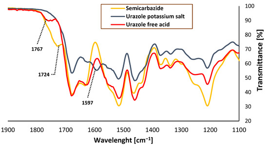 FT-IR spectrum of urazole-potassium gel, urazole free acid gel and semicarbazide gel.