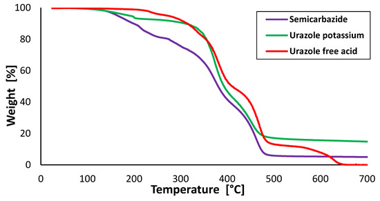 Thermogravimetric analysis of semicarbazide gel, urazole-potassium hydrogel and urazole-free acid gel.