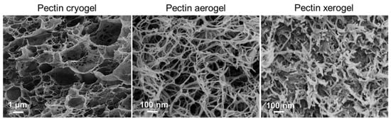 SEM micrographs of pectin cryogels, aerogels and xerogels. Reprinted with permission from [].