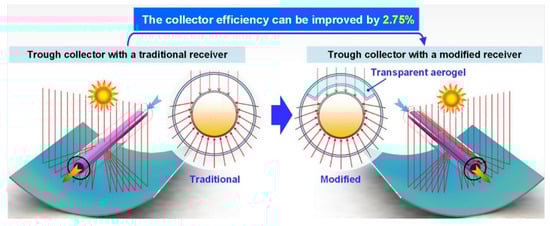 Li et al. introduced a modified evacuated receiver with solar transparent aerogels in order to improve the receiver performance. In addition, they developed and validated an optical-thermal model for modeling the energy transfer in the collector. Figure 5 exhibits the traditional evacuated receiver that was chosen as a standard model and the modified receiver that was designed with the addition of aerogels at an angle of 120° at a directly illuminated region. The results revealed that the effects of aerogels on the modified receiver are significant. Aerogels coating’s emittance greatly affects the receiver performance. The optimal efficiency was achieved by adding aerogels with opaque insulation [].