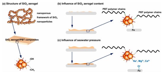 Application of silica aerogels in sea water, (a) structural evolution of silica aerogels, (b) the influence of silica content, (c) seawater pressure on silica aerogels and poly butylene terephthalate composites. Reprinted with permission from [].