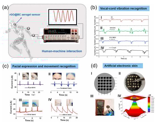 (a) Illustration of reduced graphene oxide-based aerogel-sensing platform, (b) Vocal-cord vibration recognition, (c) facial expression and body movement monitoring, and (d) aerogel-based artificial skin. Reprinted with permission from [].