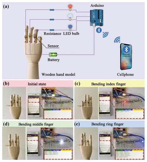 (a) Illustration of Arduino microcontroller connected to a circuit for finger movement detection, sending messages to a cellphone through Bluetooth connection. Photographs of the wooden hand model (b) in the initial state, (c) bending index finger, (d) bending middle finger, (e) bending ring finger and the corresponding photographs of the cellphone displaying messages from Arduino microcontroller and LED bulbs emitting red, white and blue lights, respectively. Reprinted with permission from [].