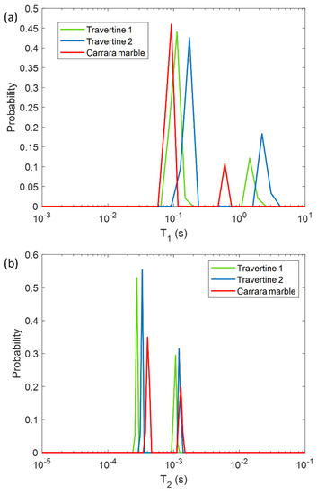 On the other hand, the longest T2 values of Carrara marble inform about its pores, which have the smallest S/V. These results suggest that Travertine has larger pores than Carrara marble, in agreement with the literature [31,35].