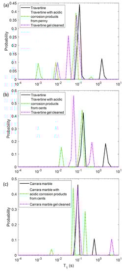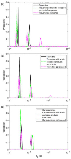In the first step, we performed NMR measurements on the soiled samples in order to test if the T1 and T2 parameters were affected by the presence of metal corrosion products and if they could inform us about different degrees of soiling of the samples. Then, we repeated the same experiments on the stone surface after the hydrogel cleaning process, with the aim of highlighting the cleaning efficacy and detecting possible gel residues. To this end, in Figure 2 and Figure 3 the T1 and T2 distributions before (black solid-line) and after the soiling process (green dashed-line), and after the cleaning process (pink dashed-line) for the two Travertines (Figure 2a,b and Figure 3a,b) and the Carrara marble sample (Figure 2c and Figure 3c) are displayed. Figure 2 and Figure 3 show how the presence of metal corrosion products on the stones surface affects the NMR relaxation times (green-dashed lines). The longitudinal relaxation time T1 seems to be strongly influenced by the heavy metal corrosion products and it significantly decreases in all the three stained samples compared to the untreated ones (see Figure 2). This result is in agreement with the literature [32,33,34] about the shortening effect of paramagnetic ions on the T1. Conversely, T2 is less affected by metal ions. The two main T2 components of Travertine soiled with penny corrosion products are reduced compared to the untreated sample (see Figure 3a) confirming the already observed effect of paramagnetic ions. Travertine soiled with corrosion products from euro cents in Figure 3b, is characterized by T2 that is not significantly affected by the presence of metal corrosion products. Furthermore, Carrara marble (Figure 3c) shows one short T2 component, which is shortened because of the metal corrosion products, and one long T2, which seems to increase. These different results can be explained on the basis of the different degree of corrosion of the coins used. Indeed, Travertine soiled with corrosion products from the penny has the highest variation in its relaxation times because of the greater degradation state of the already aged penny, which led to a greater deposition of metallic corrosion products (see Section 4.1).