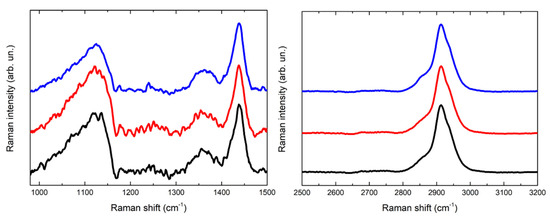 In Figure 5 and Figure 6 the Raman spectra acquired are displayed. The spectra acquired for the PVA-borax hydrogel show a great reproducibility (Figure 5), where all the features of the chemical matrices are observable and summed up in Table 1: the broad signal at 1125 cm−1 is attributable to B-O-C bond groups, while the intense signal at 1440 cm−1, along with the lower intensity band at 1355 cm−1, is related to the C-H bending modes in the PVA moieties. At higher wavenumbers, it is possible to observe a main signal at 2913 cm−1, characteristic of C-H stretching along with the shoulders at around 2855 and 2935 cm−1. These spectral features confirm the evidences reported in literature about PVA and PVA-borax hydrogels [36,37,38,39]. Regarding the hydrogel used for the cleaning of metal corrosion products (Figure 6), some aspects must be highlighted.
