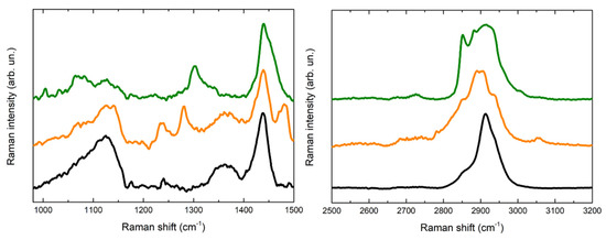 Comparison of Raman spectra acquired for the reference of PVA-borax hydrogel (black line), the cleaning gel for the cent stains on Carrara marble (orange line) and the cleaning gel for the penny stains on Travertine (green line).