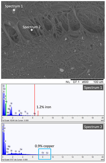 To this end, we obtained a high-resolution image of one dirty gel layer, shown in Figure 7. The heterogeneous porous structure of the PVA-PEO-borax hydrogel is visible in Figure 7. Here, many impurities in the form of crystals trapped into the hydrogel network can be observed. They confirmed the mechanical action of the gel towards particles and dust deposited on the Travertine surface before the soiling process, as suggested by the presence of Ca in the dirty hydrogel layer (see Figure 7), which comes from the Travertine structure made of CaCO3. The spectrum of one inclusion revealed the presence of 1.2% of iron (see Figure 7, spectrum 1). Because the composition of the penny coin was copper and zinc, we can suggest that some particles of iron were already present on the stone surface before that the soiling process was obtained by the deposition of acidic corrosion products from the penny. Figure 7 also shows spectrum 2 acquired in a different point, where a 0.9% of copper was detected. The presence of copper is ascribable to the corrosion products of the penny.