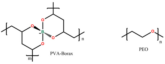 The PVA-PEO-borax hydrogel employed in this research was conceived and described in a previous study by Riedo et al. [20] and investigated by using portable NMR by Stagno et al. [12]. Its components are poly(vinylalcohol) (87–89% hydrolyzed, Mw 85,000–12,400, Sigma-Aldrich, Milano, Italy), poly(ethyleneoxide) (Mw. 37,000–4400, Sigma-Aldrich, Milano, Italy), and sodium tetraborate decahydrate (Sigma-Aldrich, Milano, Italy). In Figure 8, the chemical structure of PVA-borate and of PEO is shown.