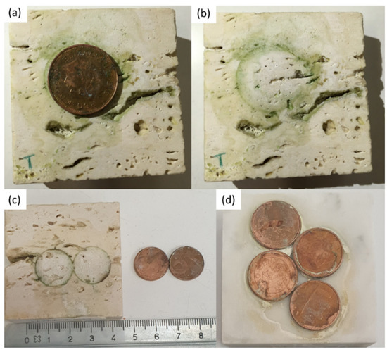 The two Travertine samples have been soiled in different way. On the surface of one Travertine (Travertine 1) an acidic corrosion of one aged penny was induced by using the solution of citric acid (Figure 9a,b), whereas on the surface of the second Travertine sample (Travertine 2) two coins of euro cents with citric acid solution (Figure 9c) have been left to react. The surface of Carrara marble was stained with the corrosion products coming from the reaction of four coins of euro cents with the citric acid solution (Figure 9d).