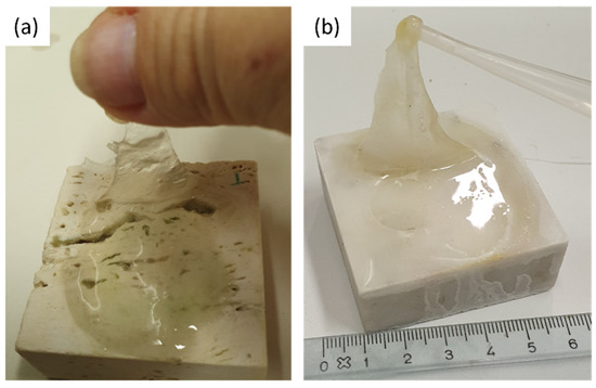 The PVA-borax hydrogel properties can also be improved by adding another polymer. Some studies [21,43] investigated the effect of agarose on the PVA-borax gel network. Agarose seems to increase the shape stability of the gel. The PVA-borax-agarose gel shows enhanced liquid phase retention and improved mechanical properties [21,43]. The PVA-B/AG gel is more suitable for the cleaning of porous materials, and if it is applied for an adequate contact time, no residues are left [21,43].