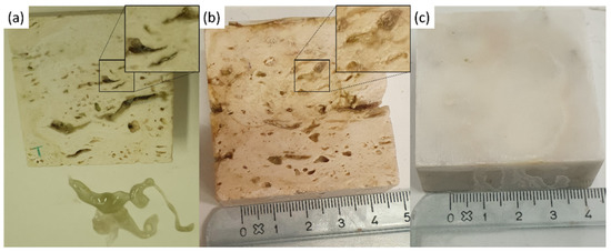 Two Travertine samples and one Carrara marble sample with size of 5 × 5 × 2 cm3 have been chosen to be studied in this work. Roman Travertine samples have been cut from the same slab and therefore have the same chemical composition characterized by 97–99% CaCO3 [45,46]. The Travertines used in this work have been cut parallel to the bedding planes, which means they have larger and more interconnected pores in comparison to samples cut perpendicular to the bedding planes [12,47]. Their porosity is around 6% [48,49]. Intercrystalline and intergranular porosity are poorly sorted and range between 0.01 and 10 μm. Open porosity has a size of up to 100 μm and can achieve a centimetric-size [50]. These macropores are poorly connected [35].