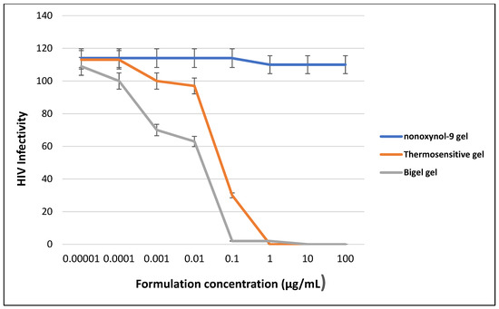 The HIV infectivity of the thermosensitive gel and bigel, compared with nonoxynol-9, showed a marked difference in the HIV infectivity rate against the CCR5 tropic HIV-1 BaL strain.