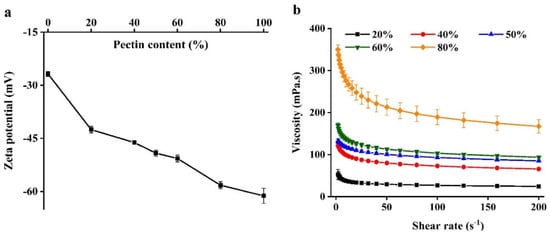 The electrical characteristics of WPI emulsion–pectin complex were tested because these determine the nature of the electrostatic interactions between biopolymers [16]. All beads with different pectin content had a highly negative charge; the solutions had a more negative surface potential when pectin content increased (Figure 1a). This effect can be attributed to the carboxylic acid group in the galacturonic acid of pectin dissociated to -COO− when dissolved in water [17].