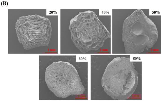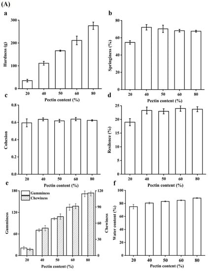 The texture characteristics of beads were measured. Hardness is regarded as the force required to attain a certain deformation, and it serves as a measure of food firmness [21]. As shown in Figure 2A, the hardness values (Figure 2a) were increasing with the content of pectin in beads increasing resulted with firmer structure. The reason may be the interstices of beads was smaller and smaller (Figure 2B). Moreover, 80% pectin exhibited the highest hardness value, suggesting the network between WPI and pectin was weak and it tend to become solid sphere from porous sphere (Figure 2B). Indeed, the springiness of all beads was increased, suggesting that adding pectin could improved the springiness of beads (Figure 2b). It had been reported that hydrogel beads should be had higher hardness and springiness so that these encapsulates containing active compounds could be applied in functional food products [22]. Cohesion is a force to the tested food can be deformed when it ruptures, and it is often used as the strength of internal bonds [21]. It showed that the cohesion values in all beads were no significant difference (Figure 2c). In addition, it could be seen that the resilience of beads was increased as pectin content increasing (Figure 2d). Chewiness is a product of hardness, cohesiveness and springiness, which is an energy needed to masticate solid food to a state ready for swallowing, reflecting the gel’s mechanical properties and provide references for evaluating subjective senses while masticating the gel [23]. Gel beads with different pectin content differed significantly in their texture property, and both the gumminess and chewiness of the high content of pectin beads were significantly higher than that of the low content (Figure 2e). The reason was that pectin molecules are highly branched with a vast number of branches and relatively large molecular weights [24]. The molecular structure of pectin usually gives food with a different texture. The increase in chewiness of beads upon pectin addition could be due to the viscosity of pectin which could be further strengthened the structure of beads. As for water content of beads (Figure 2f), all pectin-based beads contained more than 70% water and it could be up to 88.73% in beads with 80% pectin, indicating that the structure of 80% pectin beads might be less porosity, which would be slowed the permeability of active components from the particles [22].