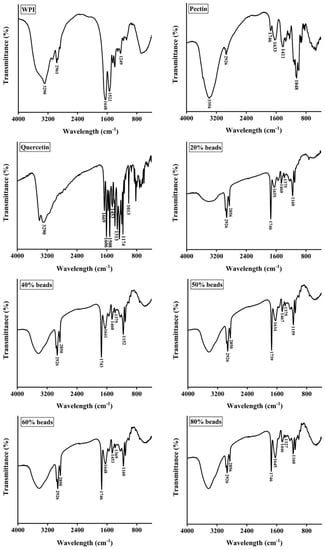 As shown in Figure 3, the FTIR spectra of WPI, pectin, quercetin, 20% beads, 40% beads, 50% beads, 60% beads and 80% beads. For WPI, the characteristic peaks of FTIR spectrum were observed at 1648, 1522, and 1249 cm−1, which represented the carbonyl (C=O) stretching of the secondary amide (amide I band), the bending vibrations of the N-H (amide II band) and the N–H stretching (amide III band), respectively. The absorption bands of pectin was detected at 3394, 2926, 1746, 1411 and 1048 cm−1 corresponding to the stretching vibrations of hydroxyl groups, the stretching vibrations of –CH bonds of methyl esters groups or pyranoid ring carbons, the carbonyl (C=O) stretching of the methyl esterified carboxyl groups, asymmetric stretching vibrations of –C–O–C– bonds and −CH groups or methyl esters groups and skeletal C–O and C–C vibration bands of glycosidic bonds and a pyranoid ring, respectively [25,26]. As for quercetin, the spectral characteristic peaks were shown at 3290, 1669, 1606, 1508, 1453, 1174, and 101 cm−1, which were stood for –OH stretching, aromatic ketonic carbonyl stretching, aromatic bending, C=C stretching of the aromatic ring, –OH phenolic bending, and aromatic stretching, respectively [27,28].