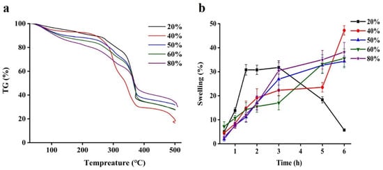 The swelling degree is a crucial factor in the release of drugs from delivery systems [32]. Gel beads with a small range of swelling ratios serves as moisture immersion barrier, reducing quercetin release from the gel beads to surrounding media [13]. In the Figure 4b, the swelling properties of all beads in distill water after soaking at 25 °C for 6 h were measured. It could be easily to find that the swelling ratio of majority of beads gradually increased as the soaking time was prolonged, except for 20% pectin beads. Among them, beads containing 40% pectin show the highest swelling ratio after 6 h up to 48.5%, indicating that its structure was porous. However, the swelling ratio of beads with 20% pectin was distinctly decreased after 3 h, it was related to absorbed water molecules, which made network become expand and finally the polymer will be diluted and lose its structural integrity [33,34]. Therefore, it would be an effective means to regulate the bioactive release behavior through controlling the swelling of the hydrogel beads [34].