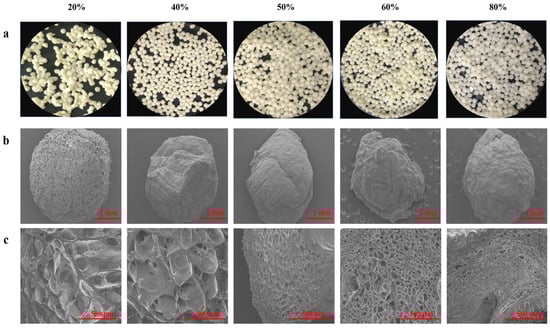 Images of quercetin-loaded beads with different content of pectin: (a) Fresh morphology of emulsion gel beads; The SEM pictures were taken at 30× (b) and (c) 100×.