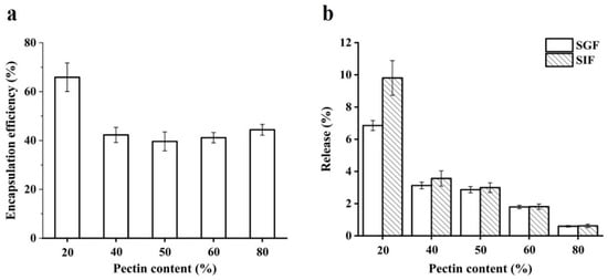 Encapsulation efficiency of quercetin from beads with different content of pectin (a); the release amount of quercetin from beads with different content of pectin in simulated gastrointestinal fluids (b). SGF and SIF represent simulated gastric fluid and simulated intestinal fluid, respectively.